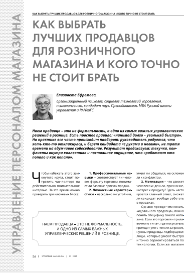 Елизавета Ефремова, организационный психолог и бизнес-тренер, объясняет, как подбирать продавцов для разных форматов магазинов.